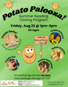 August 19th is National Potato Day and we’re celebrating withal things POTATO: a Potato Derby (pick up your Take Home Activity Kit to create your winning entry), potato art, potato science, potato games, potato prizes, and of course, potato snacks + sno cones! We’re also celebrating the last day of the Summer Reading Program. All reading logs are due by noon and all prize drawings will begin at 2:30. You do not need to be in attendance to win. Join the fun!!!