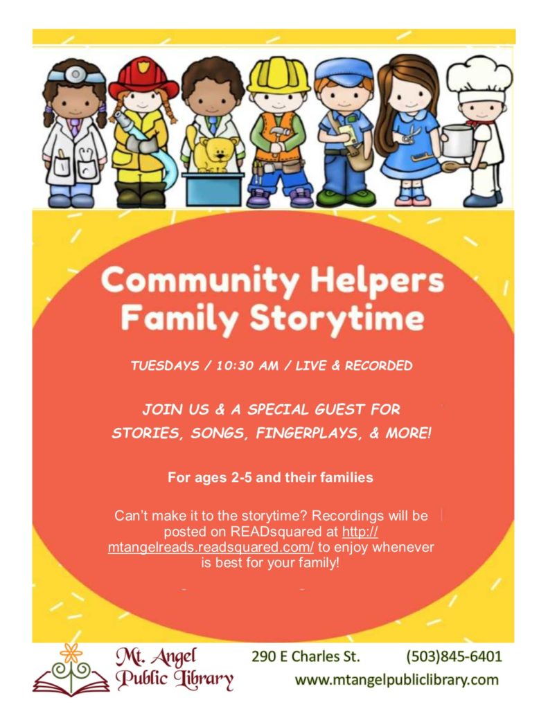 Wednesdays @ 10:30am: Family Storytime (Ages 2-5 & family members): Gather for songs, stories, crafts, and play followed by Indoor Playtime (11:00-12:00). Come play with toys and spend time with friends. All toys provided.