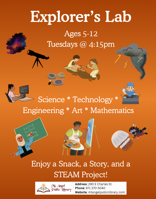 Tuesdays @ 4:15pm: Explorer’s Lab (Ages 5-11): Listen to a story about our monthly theme, join in a Science, Technology, Engineering, Art, or Math project, and enjoy a snack. Once a month we learn how to cook!